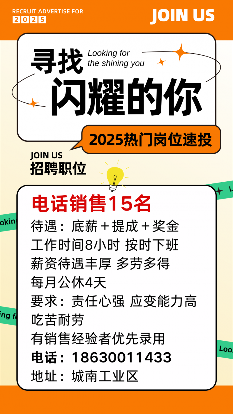 招聘:电话销售15名 待遇:底薪+提成+奖金 工作时间8小时 按时下班 薪资待遇丰厚 多劳多得 每月公休4天 要求:责任心强 应变能力高 吃苦耐劳 有销售经验者优先录用 地址:城南工业区