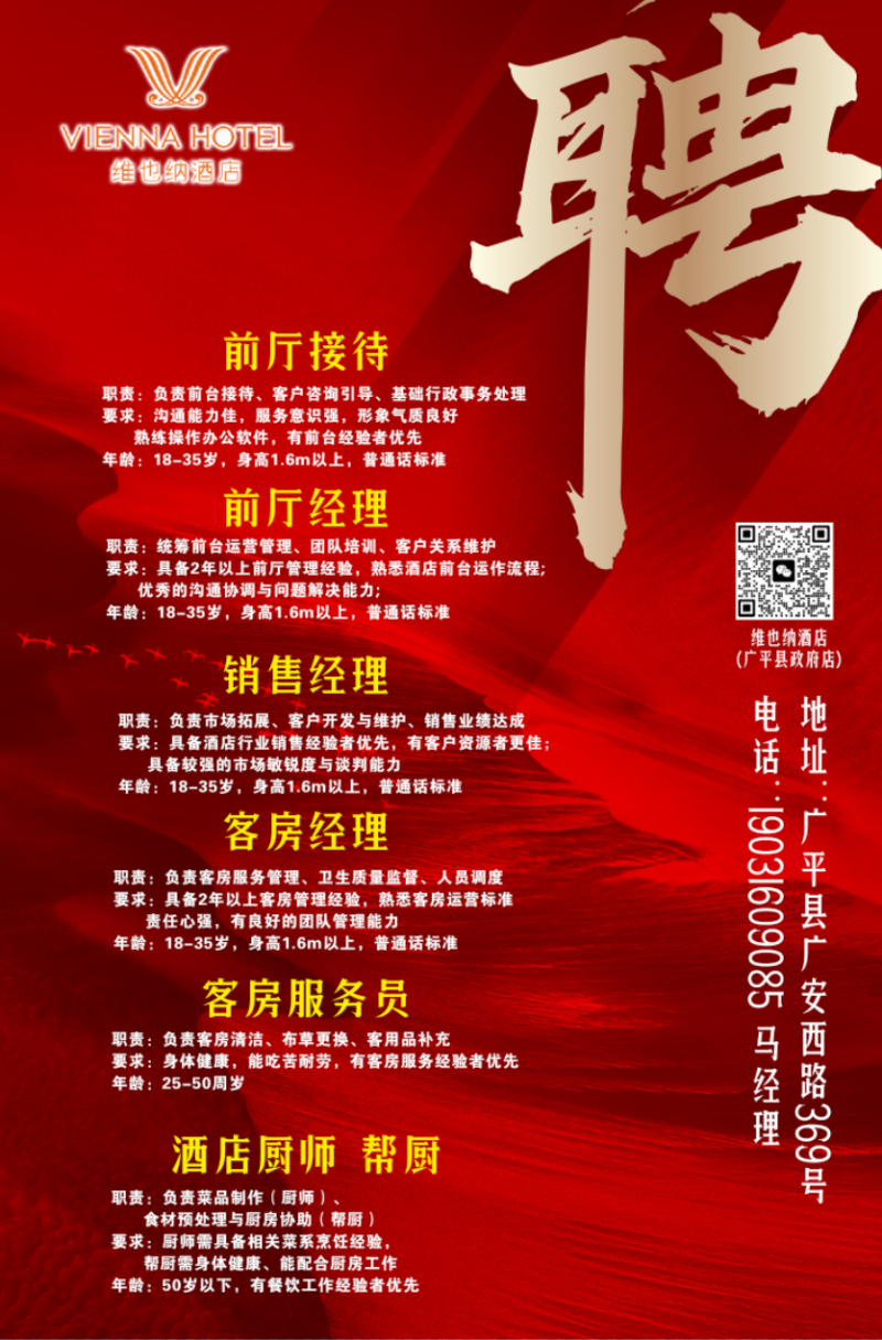 招聘 •客房经理 职责:负责客房服务管理、卫生质量监督、人员调度 要求: ◦具备2年以上客房管理经验,熟悉客房运营标准 ◦责任心强,有良好的团队管理能力 ◦年龄18-35岁,身高1.6m以上,普通话标准 •客房服务员 职责:负责客房清洁、布草更换、客用品补充 要求: ◦身体健康,能吃苦耐劳,有客房服务经验者优先 ◦年龄25-50周岁 地址:河北省邯郸市广平县广安西路