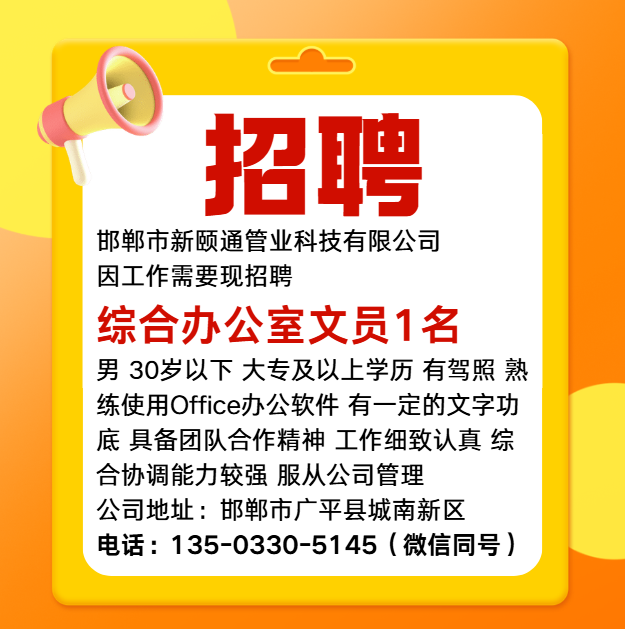 邯郸市新颐通管业科技有限公司因工作需要现招聘综合办公室文员1名,男,30岁以下,大专及以上学历,有驾照,熟练使用Office办公软件,有一定的文字功底,具备团队合作精神,工作细致认真,综合协调能力较强,服从公司管理。 公司地址:邯郸市广平县城南新区