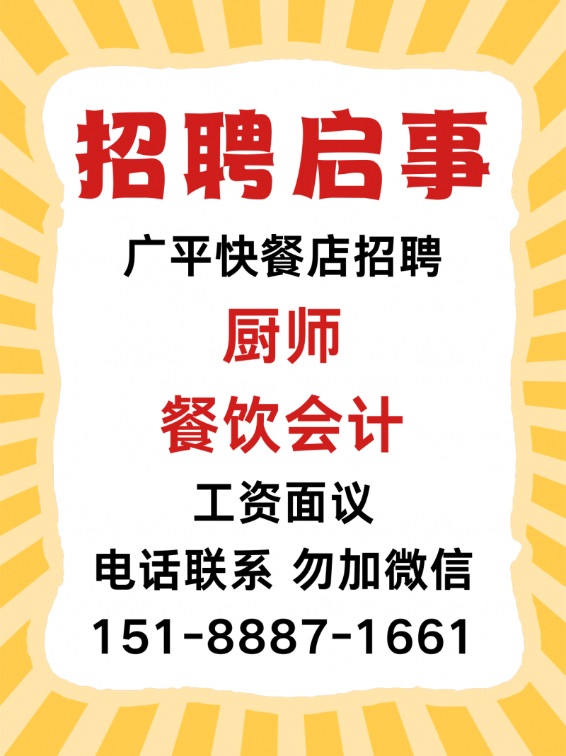 广平快餐店招聘:厨师,工资面议,电话联系 ,勿加微信