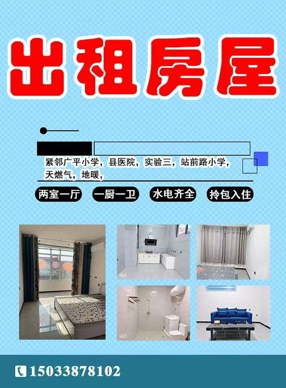 出租房屋:两室一厅,一厨一卫,紧邻广平小学,县医院,实验三,站前路小学,水电齐全,简单家具家电,有热水器,能洗澡,有天然气,地暖,天然气灶,能做饭,能取暖,拎包入住