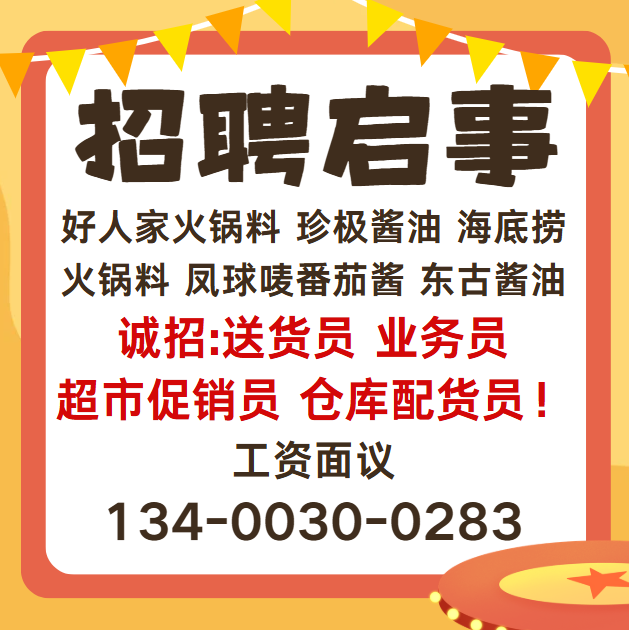 好人家火锅料,珍极酱油,海底捞火锅料,凤球唛番茄酱,东古酱油,诚招:送货员,工资面议
