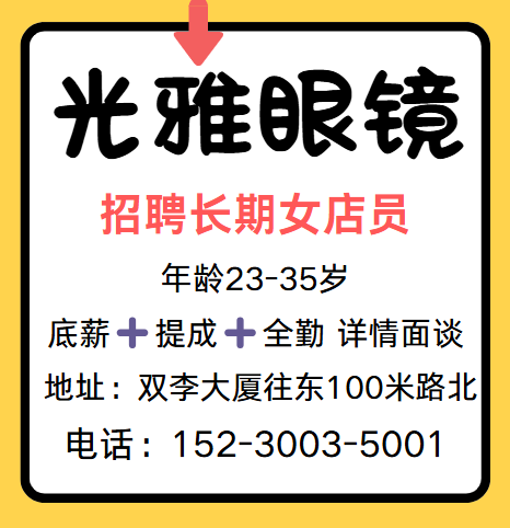 光雅眼镜招聘长期女店员,年龄23——35岁。底薪➕提成➕全勤。详情面谈。