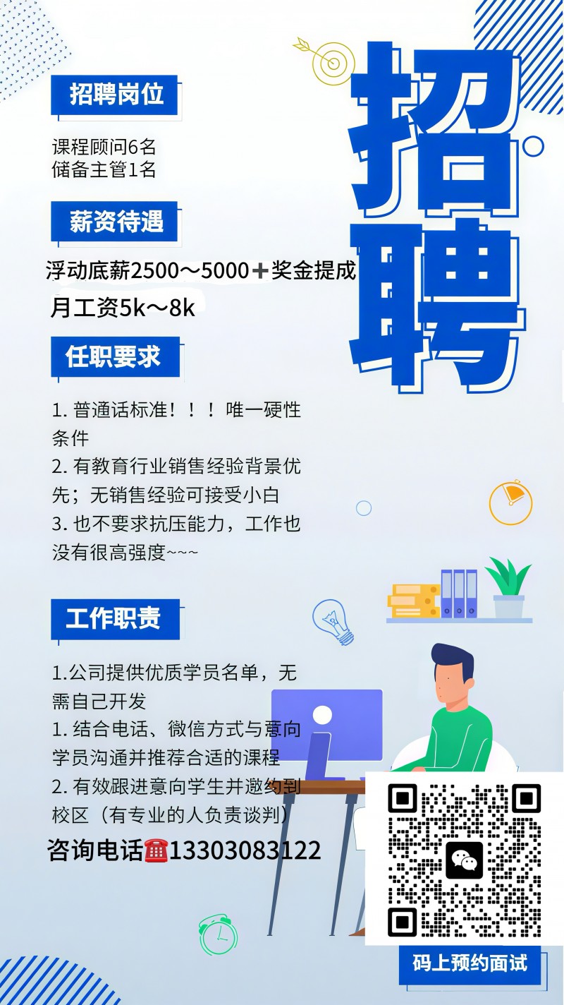 诚邀英才,招贤纳士 本公司现招聘课程顾问,年龄18-35岁,