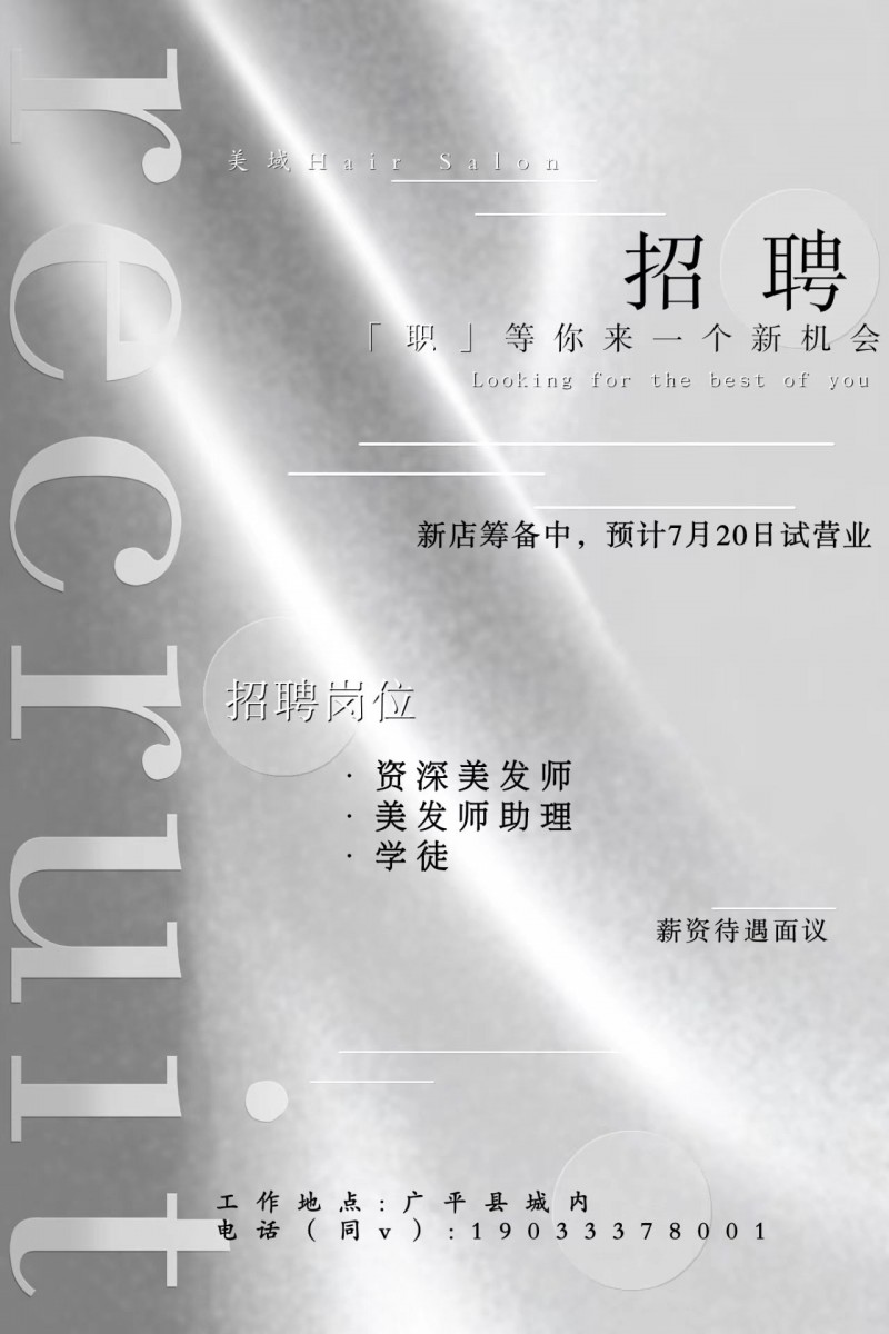 美域造型招聘: 资深美发师 美发师助理 学徒
