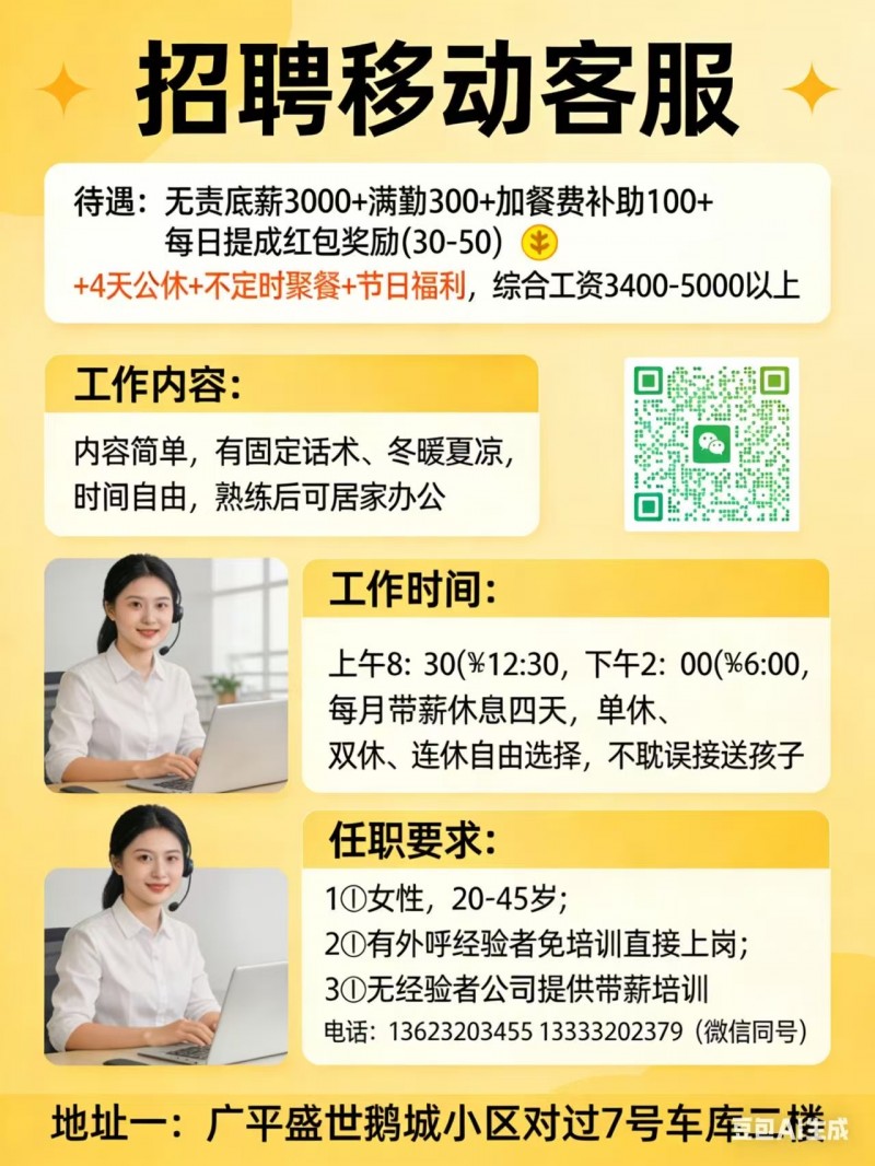 ️待遇 : 无责底薪3000+满勤300+加餐费补助100+每日提成红包奖励(30-50) +4天公休+不定时聚餐+节日福利,综合工资3400-5000以上