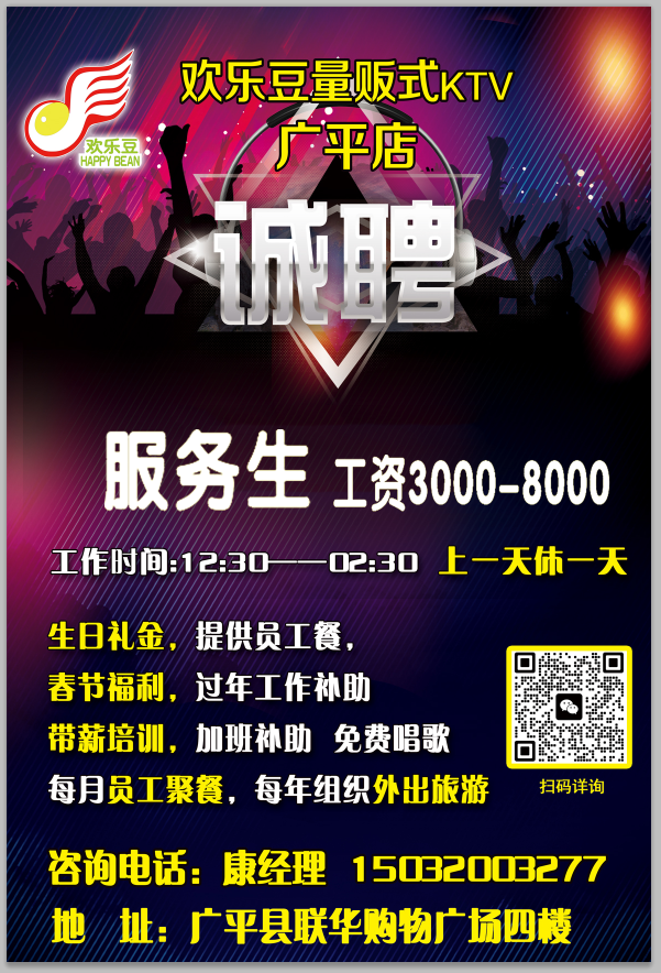 招聘 KTV服务生 薪资待遇:3000—8000/月 工作时间:中午12点半至凌晨3点,上一休一 每月员工聚餐,每年外出旅游,每月免费唱歌,过年过节福利,一日两餐等,地址:河北省邯郸市广平县联华购物广场4楼