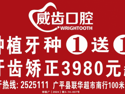 广平威齿口腔医院 招聘:主播:5人,25岁以上,沟通能力强;工资3000元加提成。 ▶︎福利待遇: 一月4天公休,一天8小时,带薪年假; 工作地址:广平县文化广场西侧威齿口腔医院