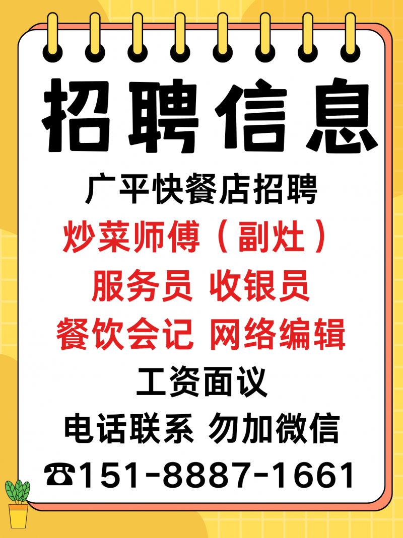 广平快餐店招聘: 收银员工资面议 电话联系 勿加微信